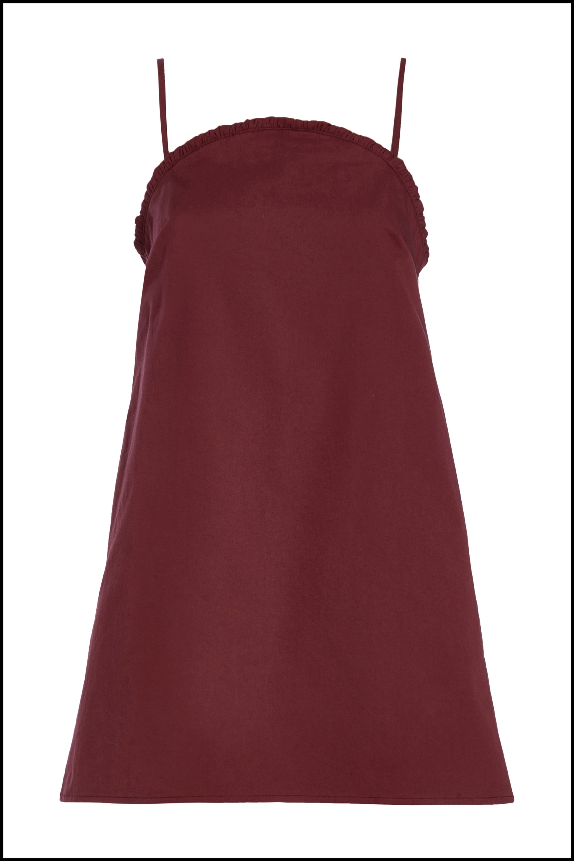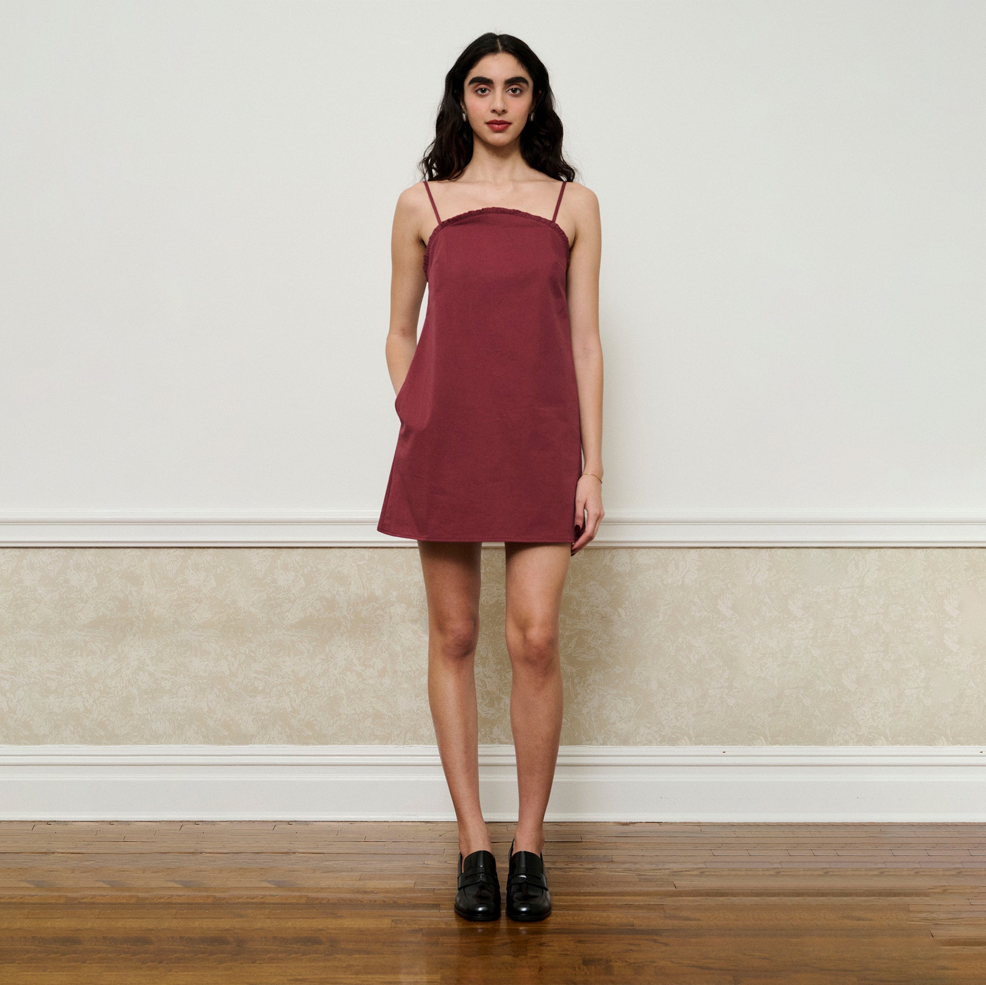 Spaghetti strap shift dress featuring an upward curved neckline with ruffle details.