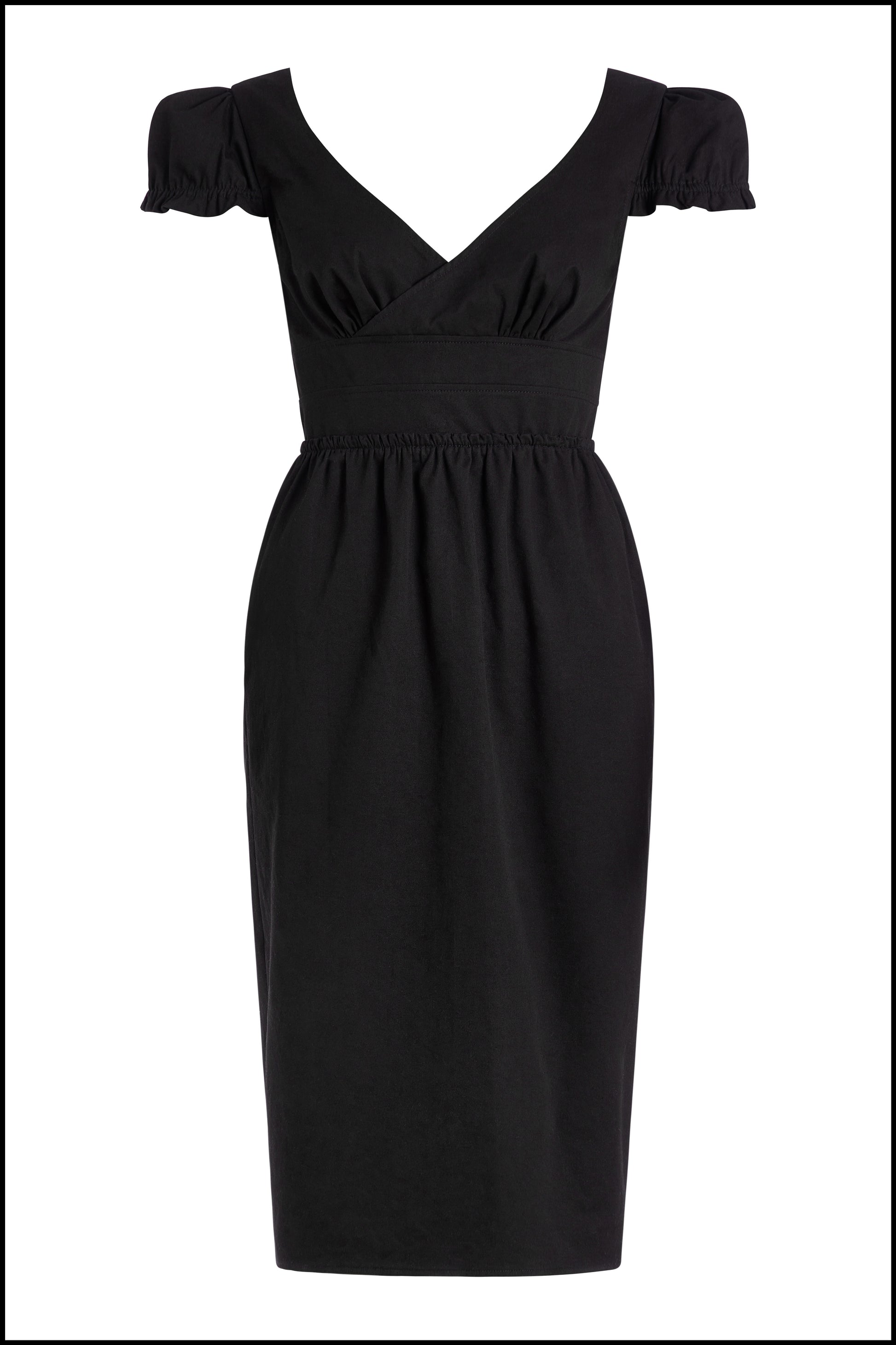 Tailored midi dress featuring a v-shape neckline and puffy sleeves