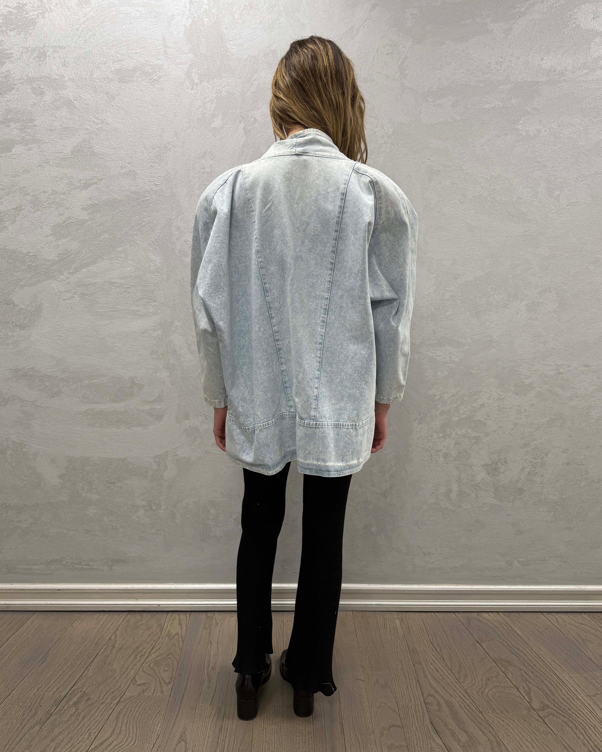 1980's style denim jacket with large pockets, shoulder pads and studded design down the front. Oversized fit.